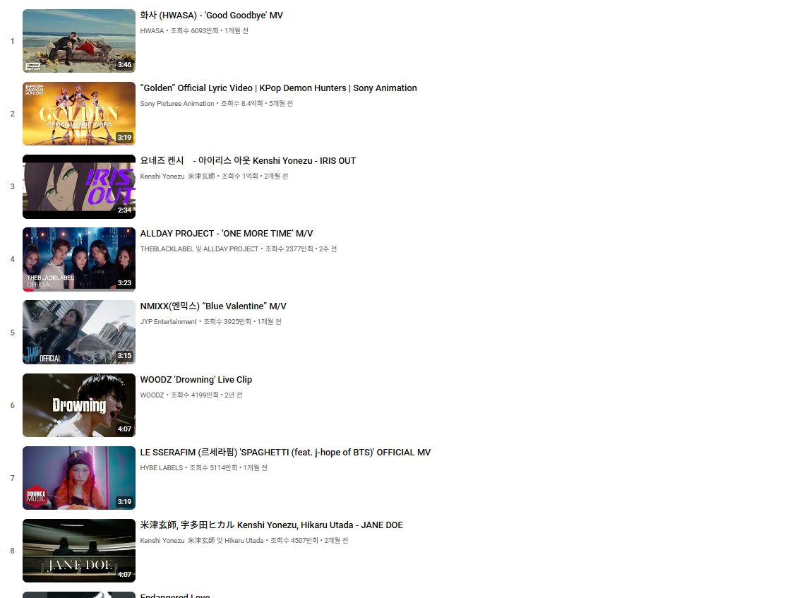 화사의 <Good Goodbye>, 임영웅의 <순간을 영원처럼>, 하츠투하츠의 <FOCUS>, 요네즈 켄시의 <IRIS OUT>, natori의 <Propose>. 열거된 노래 중 몇 곡이나 알고 있는가? 12월 첫주 유튜브에서 발췌한 '한국 인기곡 Top100'에 실린 수록곡이다.