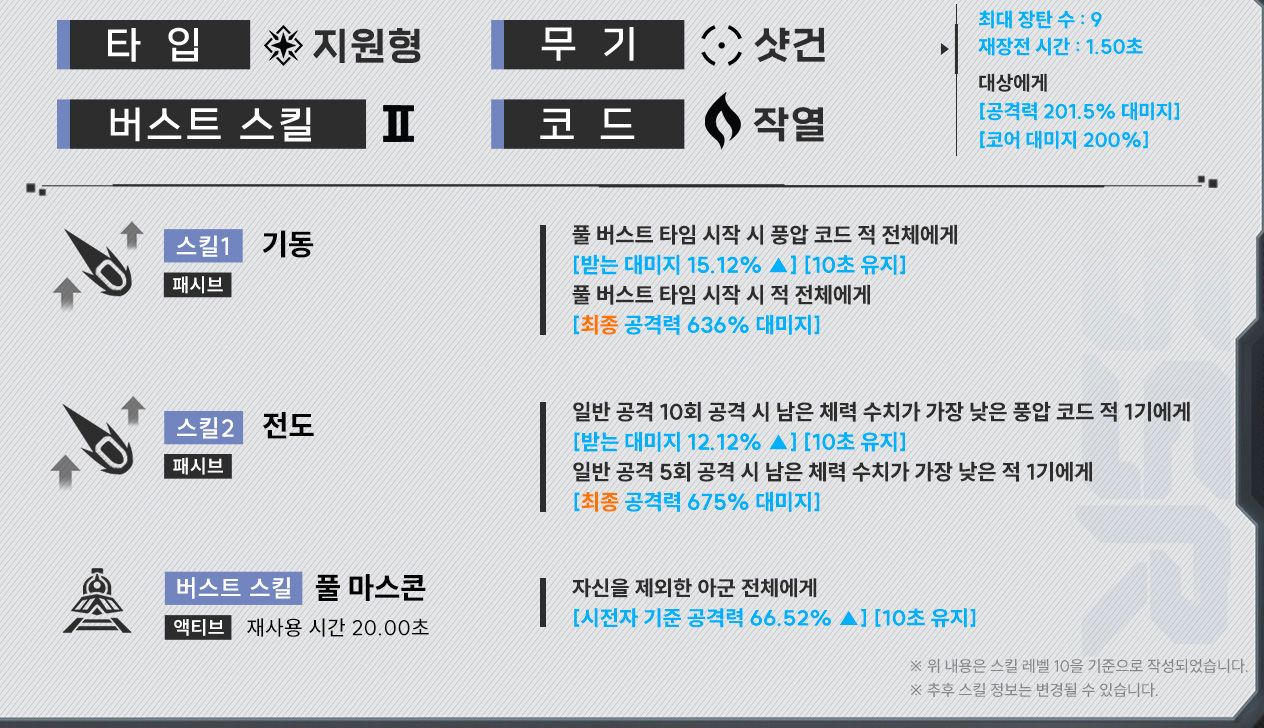 게다가 '샷건' 캐릭터이기 때문에 솔로레이드용 샷건 덱에서 활약이 가능하며, 마침 겨울 이벤트 2주차 돌입과 동시에 풍압코드 솔로 레이드가 시작되었기 때문에 솔로 레이드 상위권을 노리는 유저라면 뽑아도 후회하지 않을 캐릭터라고 정리할 수 있다.