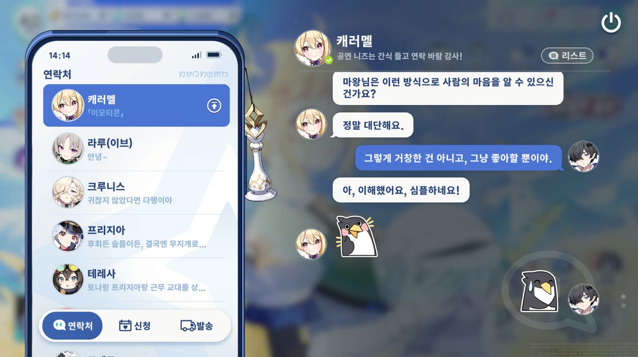 일종의 메신저 시스템인 '하트챗'. 정해진 텍스트를 읽는 것에서 끝이 아니라 개별 캐릭터들에게 데이트 신청을 해서 유저 주도의 다른 상호작용을 할 수도 있다.
