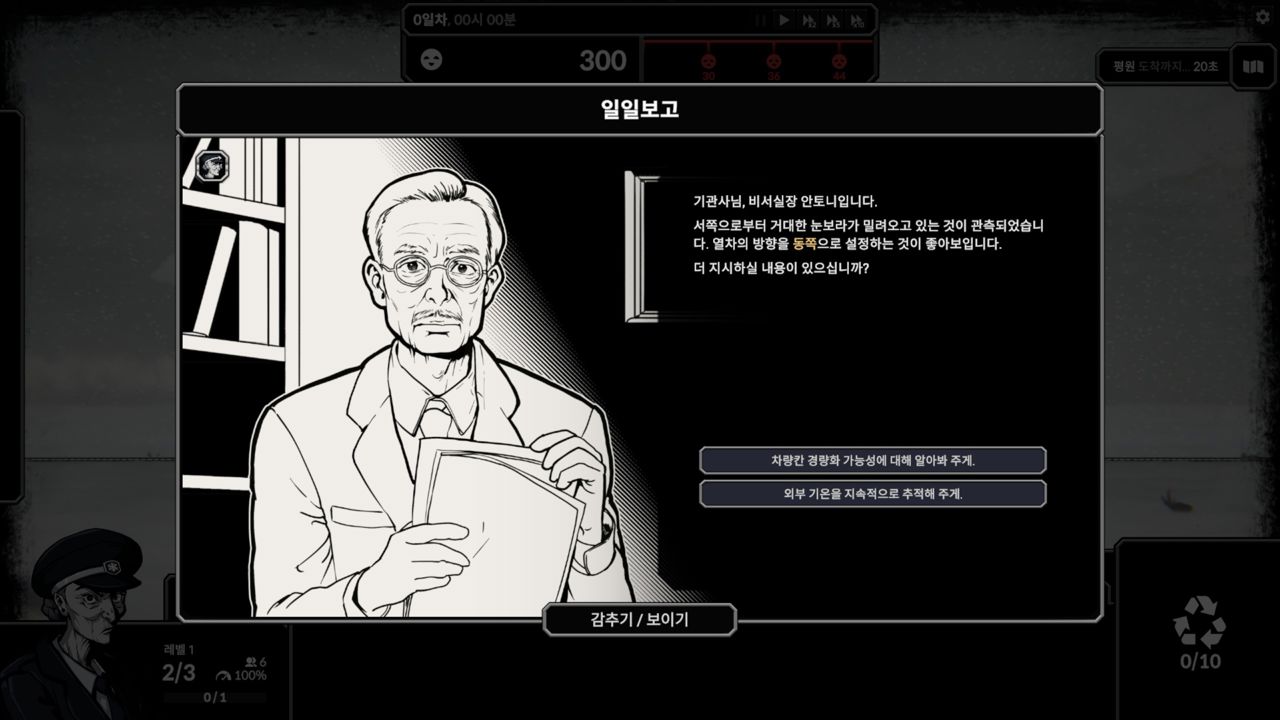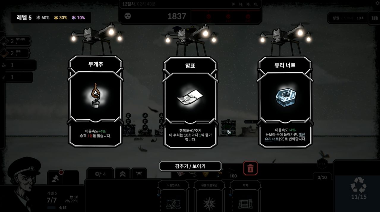 어떤 결단을 내릴지에 따라서 열차의 행복도를 올릴 수도 있고, 때론 행복도를 희생하더라도 열차의 속도를 올려 오염지대와 추위를 빠르게 통과해 행복도의 손실을 줄일 수도 있다.