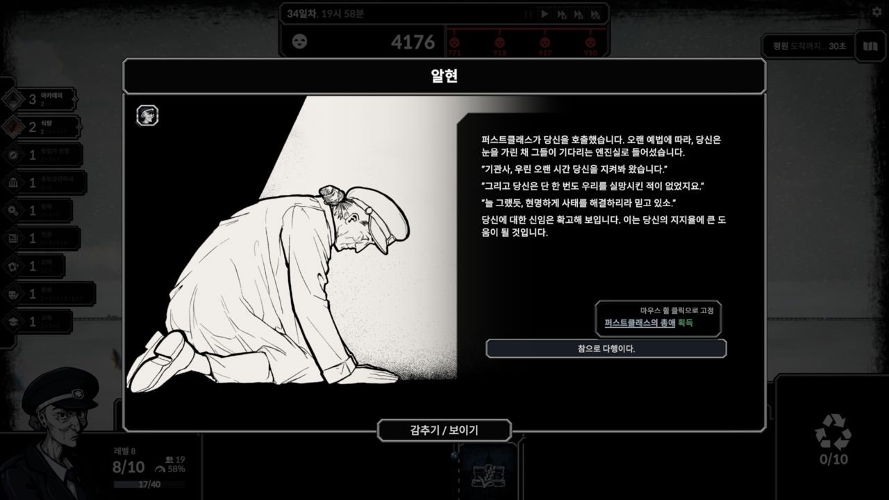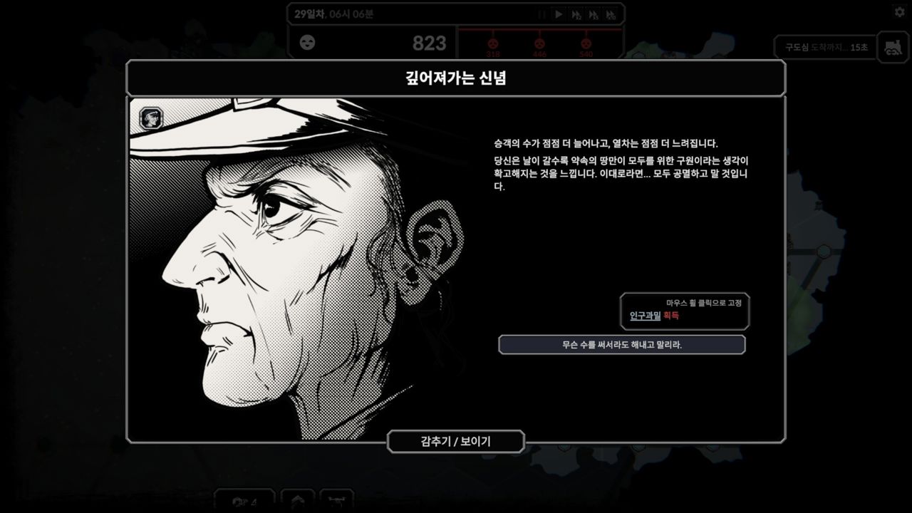 ▲때론 기관사의 인간적인 모습도 볼 수 있다. 선택지에 따라서 일시적이고 강한 패널티(60초간 행복도 40% 감소), 영구적인 약한 패널티를 선택할 수 있다(행복도 4% 감소).