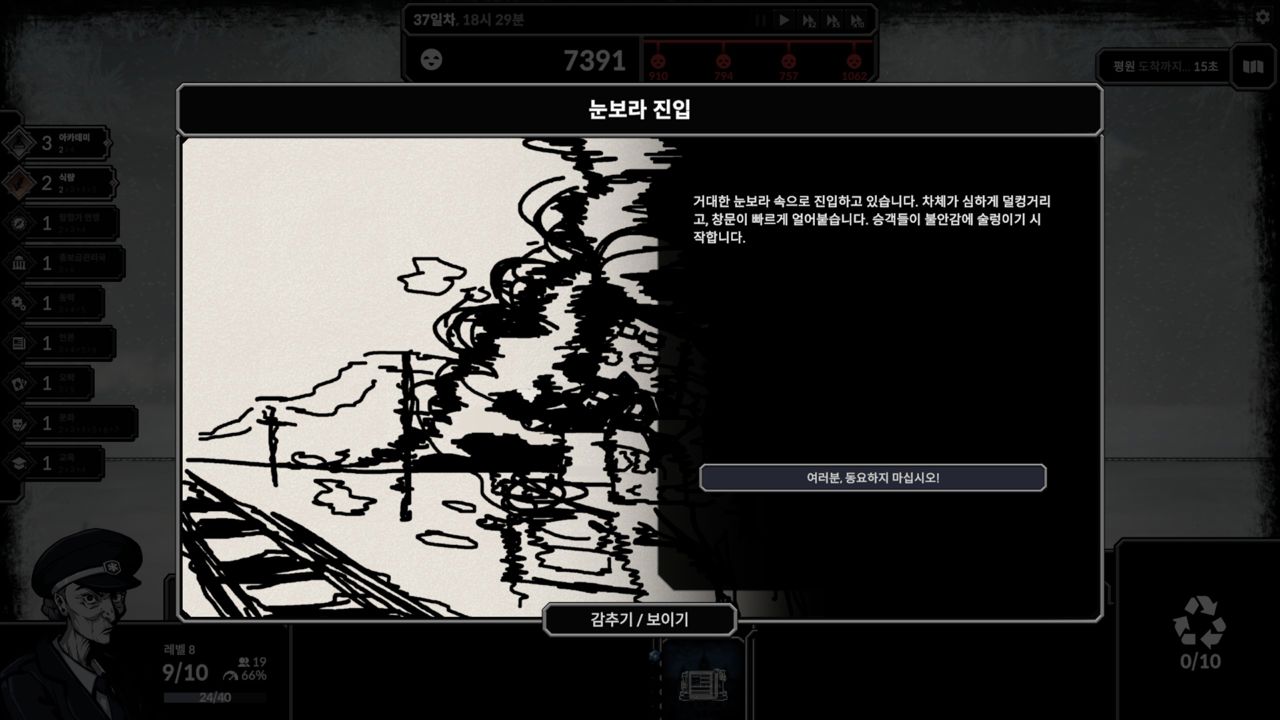▲눈보라는 지속적으로 행복도를 떨어트린다. 기관사가 축출당하는 엔딩 1순위 이유다.