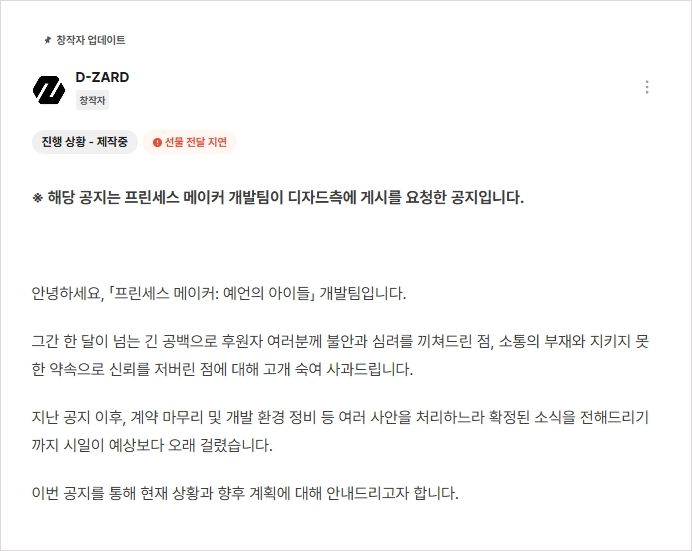 앞서 <예언의 아이들>은 지난해 8월 원 제작사인 디자드의 인력 감축 과정에서 개발진이 퇴사하고 프로젝트 이관 절차가 진행되는 등 개발 지연을 겪었다. 이 과정에서 계약 협상 지연과 소통 공백으로 펀딩 관련 일정에 차질이 발생했다. 그러나 디자드의 공지에 따르면 이번 계약으로 중단되었던 게임 개발과 펀딩 굿즈 배송 등 프로젝트 전반의 업무가 재개된다.