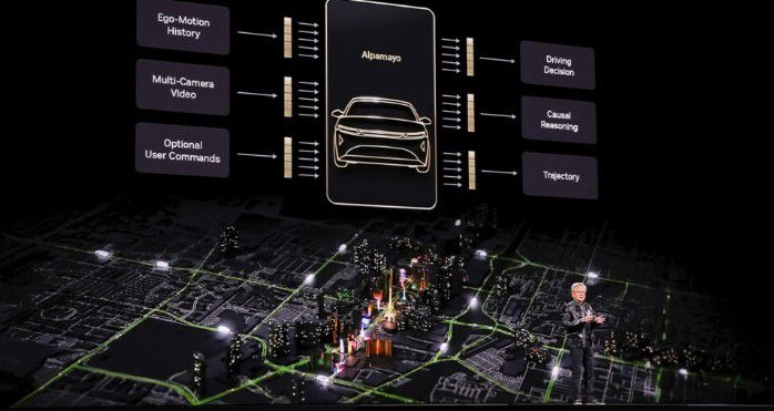 젠슨 황 CEO는 "센서 입력을 받아 조향, 브레이크, 가속을 작동시키는 것에 그치지 않고, 앞으로 수행할 행동에 대해서 추론까지 한다"고 말하며, 혼잡한 샌프란시스코 교통 상황에서 차량이 매끄럽게 주행하는 영상을 소개했다.