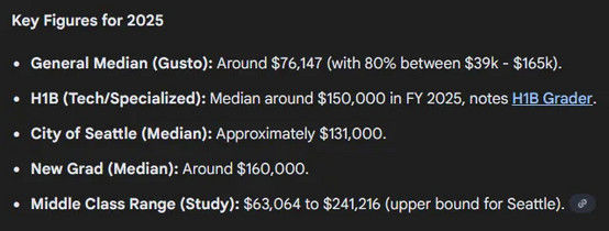 2025년 시애틀의 급여 상황과 중산층 범위 전체 중위소득 76,147달러(약 1억 1,020만 원)