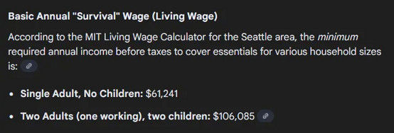 MIT 추정에 따르면, 시애틀에서 미혼 성인의 최소 생존 임금은 세전 61,241달러(약 8,867만 원)다.
