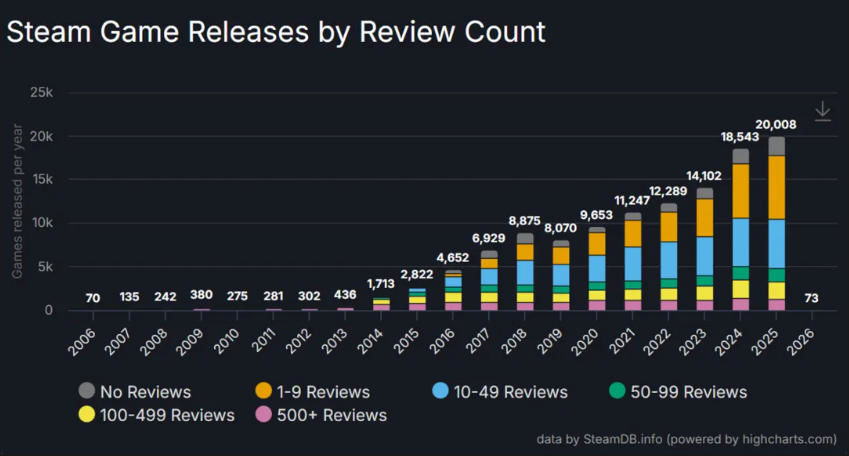 스팀DB 통계에 따르면 2025년은 지난 10년을 통틀어 신작 출시가 가장 활발했던 해로, 2만 권 이상의 신작이 쏟아져 나왔다. 다만 스팀DB는 출시작의 거의 절반 가까이가 리뷰 10개 미만을 기록하고 있으며, 리뷰 100개 이상을 확보하는 게임의 비중은 늘고 있지만 그 속도는 매우 더디다고 분석했다.