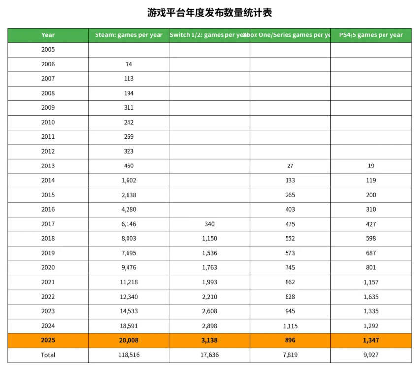 먼저 짚고 넘어갈 점은 신작 출시 총수가 시장의 건실함을 완벽히 대변하지는 않는다는 사실이다. 통계치에는 아마추어 수준의 게임들이 다수 섞여 있으며, 특히 스팀과 닌텐도 스위치 플랫폼에서 이러한 경향이 두드러진다. 스위치에는 유행을 쫓는 카피캣들이 내놓은 함량 미달의 작품들이 상당수 포함되어 있으며, 플레이스테이션 역시 예외는 아니다. 하지만 이러한 한계에도 불구하고, 데이터를 통해 각 플랫폼이 보여주는 시장의 흐름과 뚜렷한 추세를 파악할 수 있다.