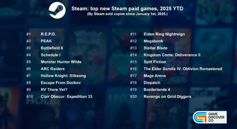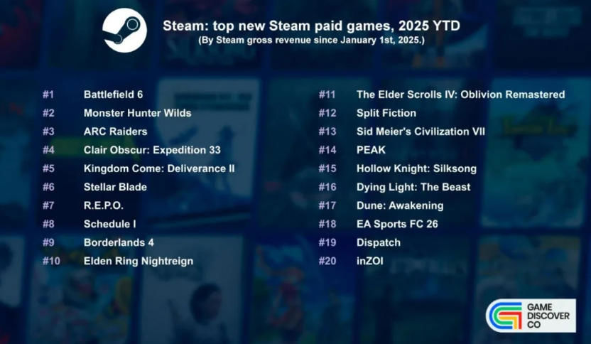 2025년 스팀 매출 상위 20위를 차지한 신작은 순서대로 다음과 같다. <배틀필드 6>, <몬스터 헌터 와일즈>, <아크 레이더스>, <클레르 옵스퀴르: 33 원정대>, <킹덤 컴: 딜리버런스 2>, <스텔라 블레이드>, <R.E.P.O.>, <스케줄 I>, <보더랜드 4>, <엘든 링 밤의 통치자>, <엘더스크롤 4: 오블리비언 리마스터>, <스플릿 픽션>, <문명 7>, <피크>, <할로우 나이트: 실크송>, <다잉 라이트: 더 비스트>, <듄: 어웨이크닝>, <EA 스포츠 FC 26>, <디스패치>, 그리고 <인조이>가 이름을 올렸다.