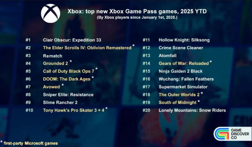 마이크로소프트가 구독 서비스에 공을 들이고 있다는 점을 고려하면, 엑스박스 게임패스의 성과 역시 주목할 만하다. 그중에서도 <클레르 옵스퀴르: 33 원정대>는 2025년 서드파티 게임패스 게임 중 가장 높은 다운로드 수를 기록했다. 이 게임은 최신 게임패스 타이틀 인기 순위에서 <오블리비언 리마스터>와 대등한 위치를 점할 정도로 큰 관심을 받았다.