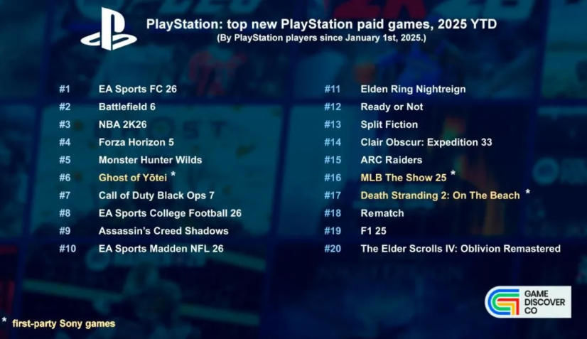 2025년 플레이스테이션 플랫폼에서 유저 수가 가장 많았던 신작 20종은 순서대로 다음과 같다: <EA 스포츠 FC 26>, <배틀필드 6>, <NBA 2K26>, <포르자 호라이즌 5>, <몬스터 헌터 와일즈>, <고스트 오브 요테이>, <콜 오브 듀티: 블랙 옵스 7>, <EA 스포츠 칼리지 풋볼 26>, <어쌔신 크리드 섀도우스>, <EA 스포츠 매든 NFL 26>, <엘든 링 밤의 통치자>, <레디 오어 낫>, <스플릿 픽션>, <클레르 옵스퀴르: 33 원정대>, <아크 레이더스>, <MLB 더 쇼 25>, <데스 스트랜딩 2: 온 더 비치>, <리매치>, <F1 25>, 그리고 <엘더스크롤 4: 오블리비언 리마스터>다.