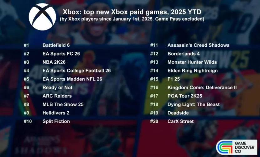 플레이스테이션과의 판매량 격차는 뚜렷하지만, 2025년 엑스박스 상위 10위권 신작들의 판매량은 여전히 100만 장을 상회했다. 또한 상위 20위 내에 진입한 모든 게임이 최소 30만 장 이상의 판매고를 기록했다.