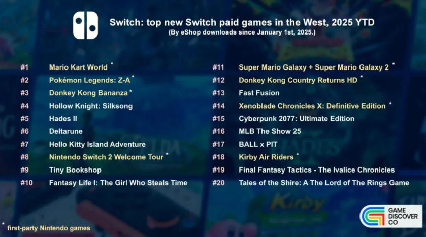 마지막으로 서양 시장을 중심으로 한 2025년 닌텐도 스위치 e숍 신작 판매 현황을 살펴보자. 닌텐도 플랫폼의 특성상 퍼스트파티 게임은 실물 패키지 버전의 판매 비중이 매우 높다. 따라서 디지털 판매량만을 집계하는 e숍 차트는 닌텐도 자체 출시작에 다소 불리한 구조임에도 불구하고, 상위 20위권 중 8종이 닌텐도 배급 타이틀이었다.