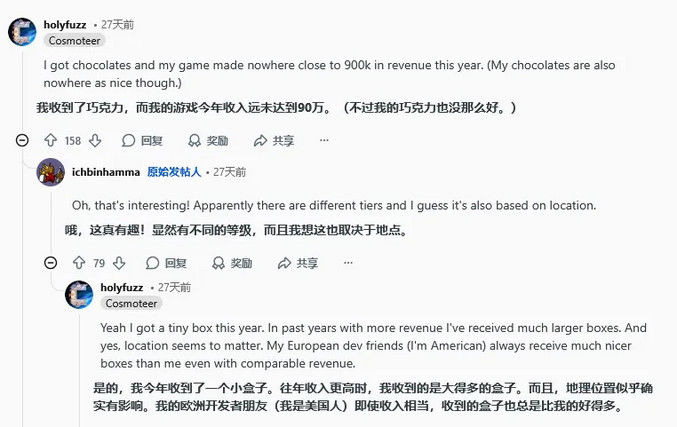 물론 많은 개발자가 계산기를 두드리며 조롱 섞인 농담을 던지기도 한다. 165달러짜리 초콜릿 한 상자를 먹기 위해 스팀에 약 24만 달러(약 3억 5,462만 원)의 플랫폼 수수료를 지불해야 하기 때문이다. 아마도 세계에서 가장 비싼 초콜릿 중 하나일 것이다. 하지만 불확실성이 가득한 게임 산업에서 게이브 뉴웰이 직접 인증한 '연말 보너스'를 받는다는 것은, 샴페인을 터뜨리거나 초콜릿 상자를 열어 축하할 만한 충분히 기분 좋은 일임은 분명하다.