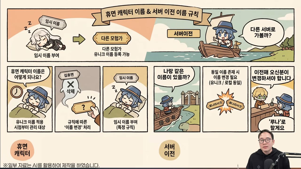 유니크 닉네임은 다른 서버에서 사용 중인 중복 닉네임을 전환할 수 없는 절대 규칙을 기반으로 운영된다. 도입 시점부터 장기간 접속하지 않은 캐릭터는 휴면 캐릭터로 전환되어 관리 대상이 되며, 이들에게는 ‘임시 이름’이 부여된다. 임시 이름으로 변경된 닉네임은 이후 다른 모험가가 유니크 닉네임으로 선점해 사용할 수 있도록 개방될 예정이다.