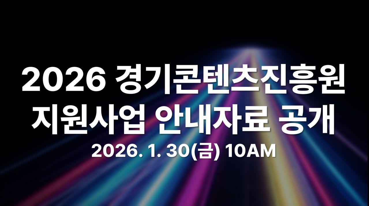 경기콘텐츠진흥원은 오는 1월 30일 오전 10시에 2026년 경기도 콘텐츠 산업 지원 사업의 안내자료를 공식 누리집 및 공식 유튜브 채널을 통해 공개한다. 경콘진은 2026년을 기점으로 'AI 기반 콘텐츠 산업 전환'과 '글로벌 경쟁력 강화'를 양대 전략으로 설정하고, 콘텐츠 기업의 전 주기 성장을 체계적으로 지원할 계획이다.
