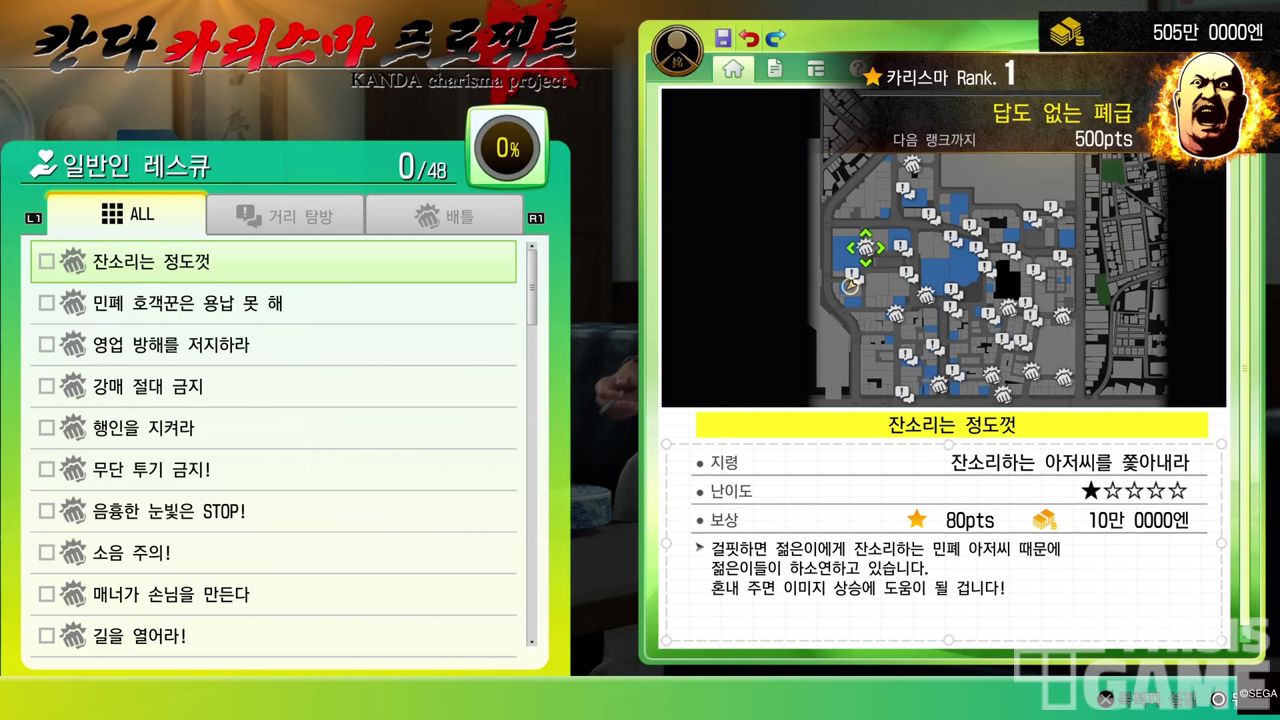 ▶ 칸다 카리스마 프로젝트에선 거리의 양아치들을 퇴치해서 칸다의 평판을 올려야 한다. 그나저나 랭크 이름이 상당히 폭력적이다...