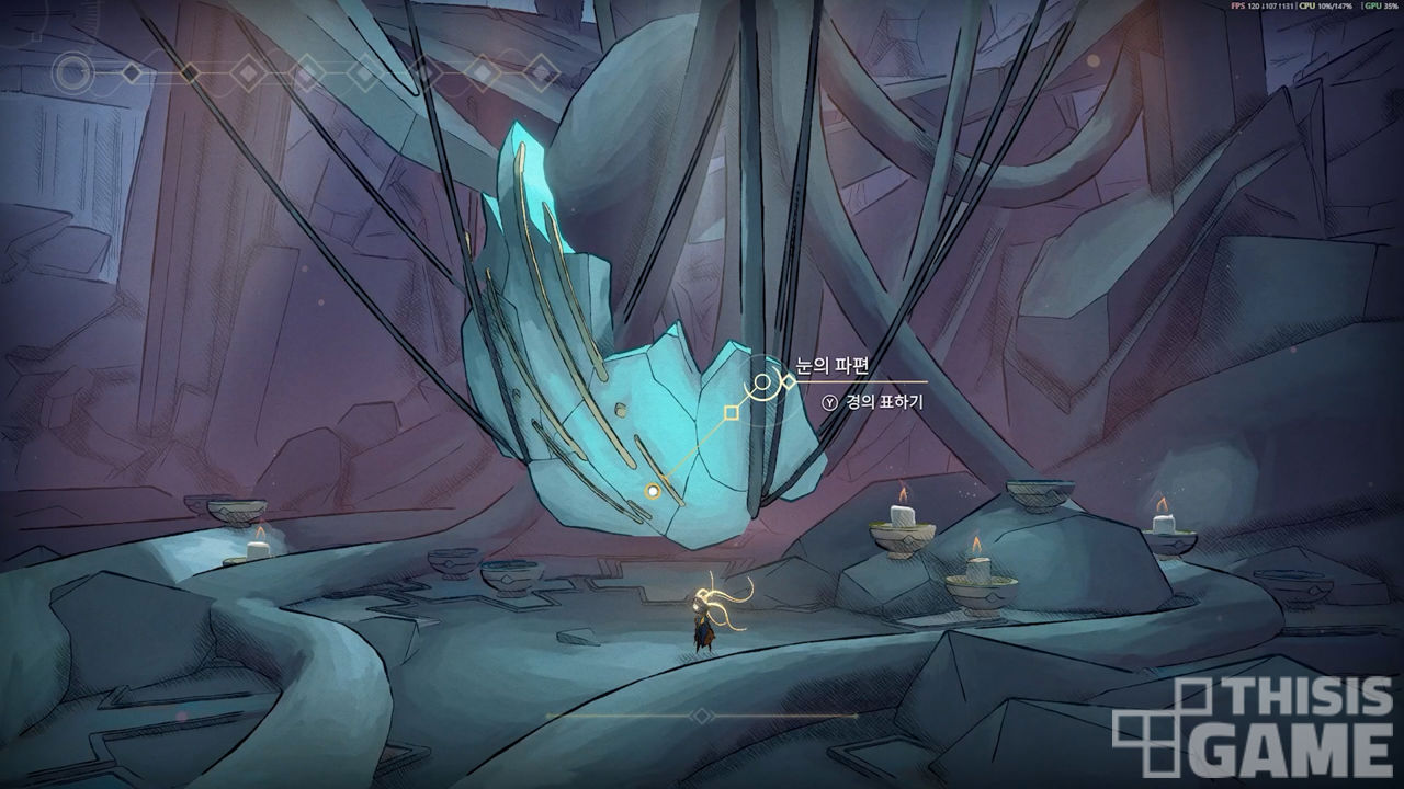 갈 수 있지만 가지 않은 곳은 깜빡이는 빗금으로, 열쇠가 필요하거나 반대쪽에서 막혀 갈 수 없는 곳은 붉은 선으로, 연결된 길이지만 일시적인 장애물이 있는 곳은 두꺼운 회색 선으로 보여줘 길을 잃는 경우는 없었습니다. 동선의 연결과 맵 구성, 오가며 만나는 연출도 물 흐르듯 이어지면서 뻔하지 않아 좋았고요.