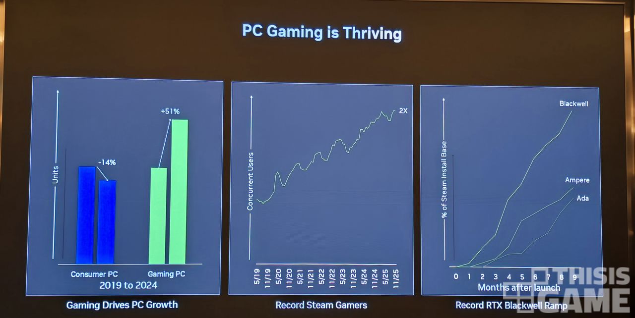 ▲ 그래프 왼쪽부터 5년 사이 게이밍 PC 판매만 폭발적으로 늘었던 자료, 스팀에서 게임을 즐기는 유저 수가 늘어난 점, RTX 블랙웰 판매 속도가 Ada나 Ampere 출시 초기보다 빠름을 보여주고 있다.