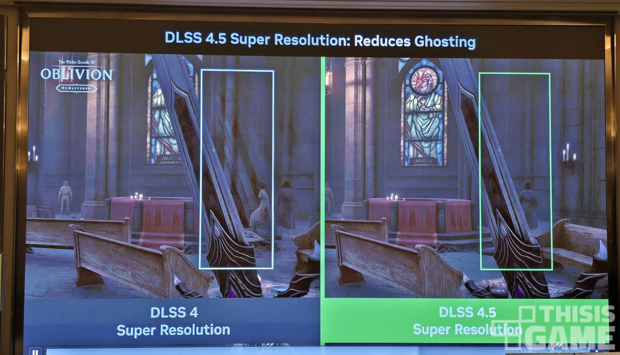 ▲ DLSS 4에서는 화면 왼쪽의 예시처럼 <엘더 스크롤 4 오블리비언 리마스터>에서 검을 들고 시야를 옮기면, 검의 잔상이 일렁이며 남는 '고스팅 현상'이 모두 해결되진 않았는데, DLSS 4.5에서는 이러한 움직임 속에서도 잔상이 남지 않는 모습을 볼 수 있다.