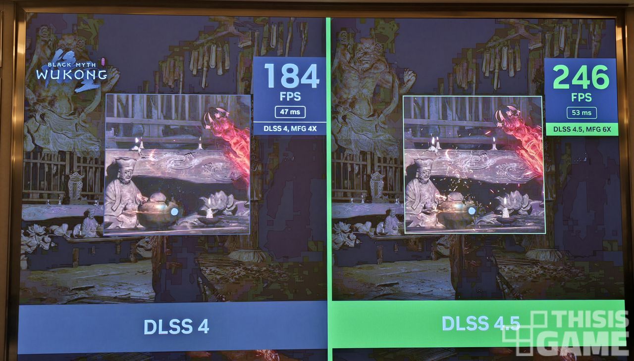 ▲ <검은 신화: 오공>으로 보여준 예시. 우측(DLSS 4.5)이 246프레임까지 나오고, 불꽃의 재가 튀어오른 파티클 표현도 더 디테일하게 보이는 것을 볼 수 있다.(다만, 레이턴시(지연)만 아주 조금 더 높게 잡히는 순간들이 있다)
