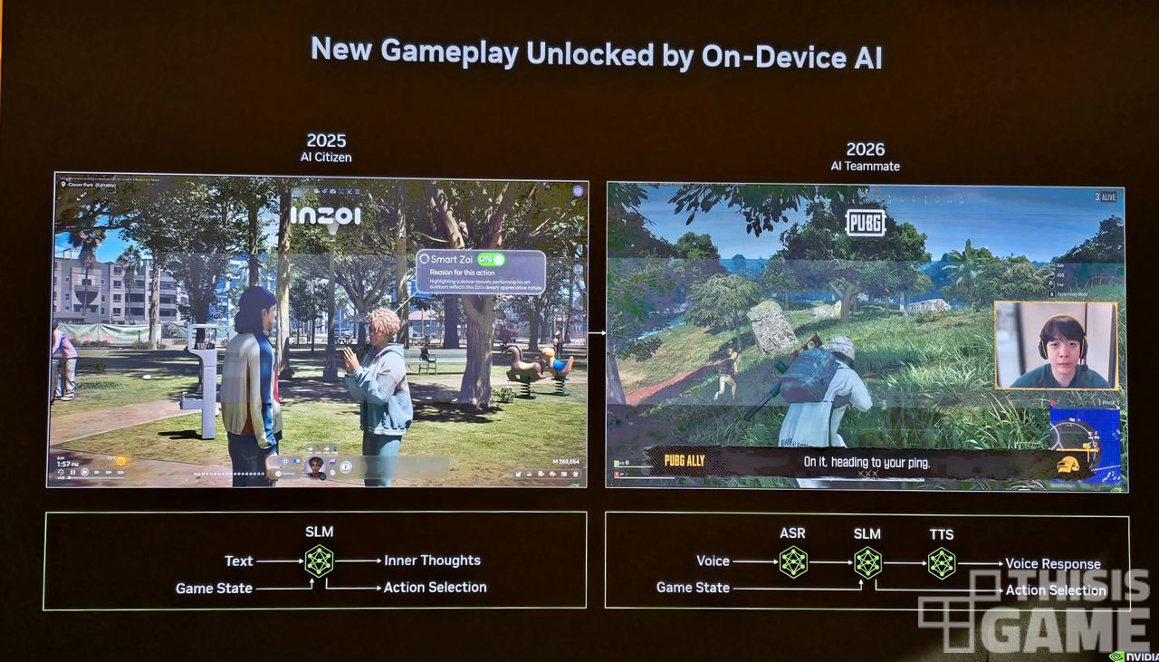 엔비디아는 크래프톤의 <인조이> '스마트 조이', <배틀그라운드>의 '펍지 앨라이' 등의 예시를 들어, 인게임에서도 AI 기술이 적용되는 사례들에 대해 운을 띄웠다.