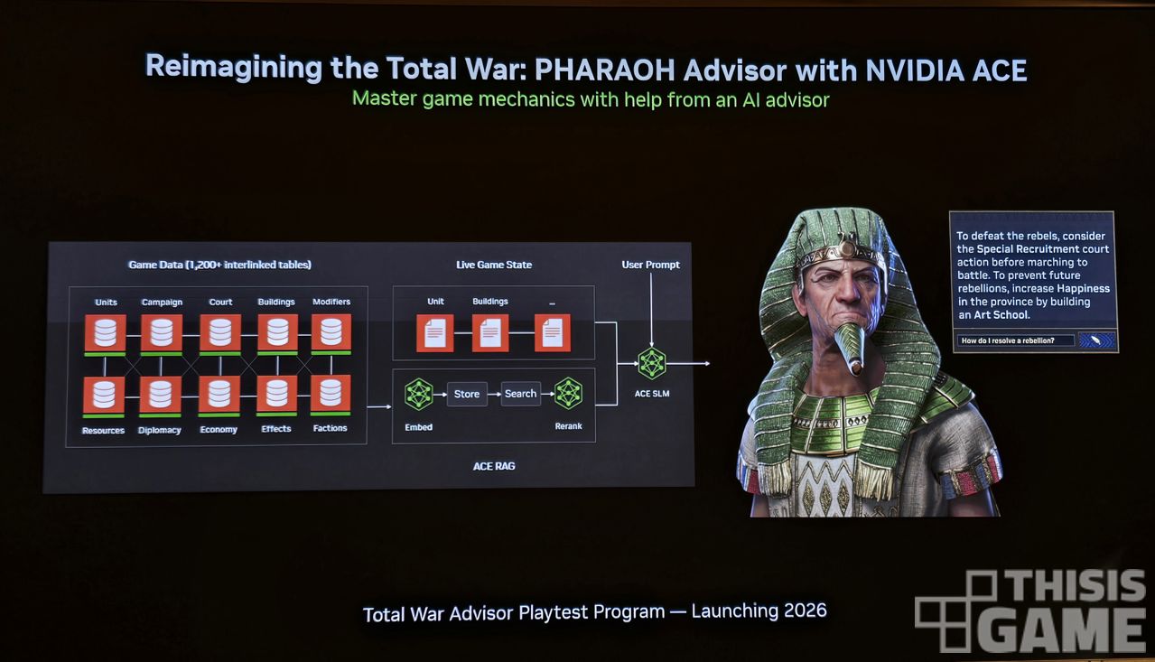 이번에 중점적으로 소개된 기술은 <토탈 워: 파라오>에 적용될 '어드바이저' 시스템이었다. 엔비디아 ACE 기술이 적용됐는데, 이 기술은 생성형 AI로 NPC에 생동감을 불어넣는 기술이다.