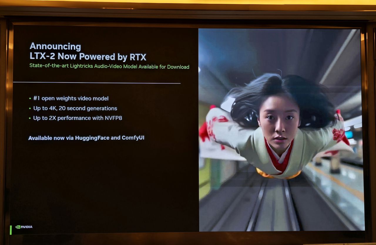 이미지와 영상을 생성해내는 예시가 소개됐다. 가령, RTX에서 FlUX 2(이미지 생성), LTX 2(Comfy UI 기반의 오디오-비디오 오픈 웨이트 모델)도 지원하는데, 기존에는 전체 사이즈가 크지만 NVFP4, NVFP8를 활용해 메모리 사용량을 줄이는 방향으로 활용할 수 있다는 것이다.