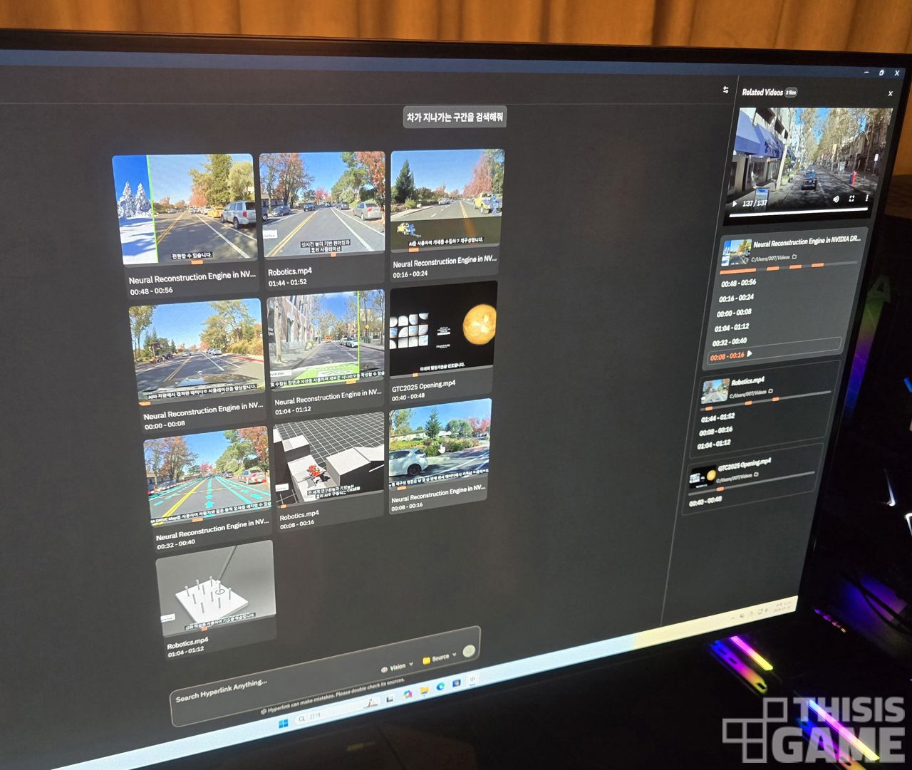 ▲ 오늘 발표 현장에서의 시연 예시 중 하나다. 넥사 하이퍼링크에게 "차가 지나가는 구간을 검색해줘"라고 입력하니, 로컬 파일 영상에서 차가 지나가는 부분만 주황색으로 따로 표시해주면서 알려주는 장면이다.