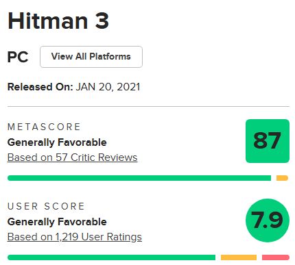 ▶ 87점을 기록한 <히트맨 3>의 메타크리틱 점수. <히트맨 1>은 84점, <히트맨 2>는 82점을 받았다.