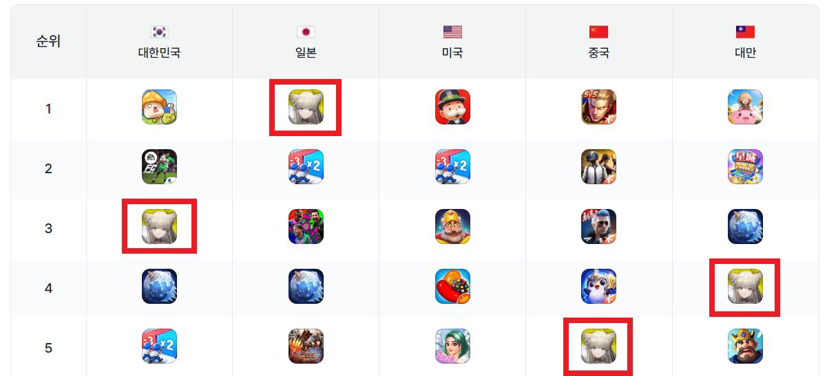 이 중에선 일본과 중국의 매출 순위를 주목할 필요가 있다. 일본 시장의 경우 서브컬처 종주국일 뿐더러, <몬스터 스트라이크>처럼 긴 시간 인기를 끈 게임들이 매출 상위권에 머무르는 경우가 많기 때문이다. 중국 시장은 인구에 비례한 화력을 기대할 수 있어 주목할 만하다.