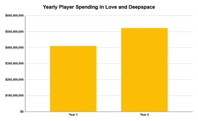 <러브앤딥스페이스>는 2024년 1월 18일 글로벌 출시 직후 빠르게 성공 가도에 올랐으며, 차트 상위권을 차지하며 출시 30일 만에 4,320만 달러를 벌어들였다. 이어 1년 차에 4억 1,000만 달러의 매출을 기록한 데 이어, 2년 차에는 전년 대비 27% 증가한 5억 2,260만 달러의 추가 매출을 올렸다.