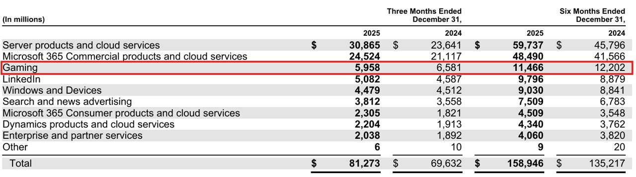 현지 시각 29일 발표된 MS의 2025 회계연도 2분기(10~12월) 실적에 따르면, 게임 부문 매출은 전년 동기 65억 8,100만 달러 대비 9% 감소한 59억 5,800만 달러를 기록했다.
