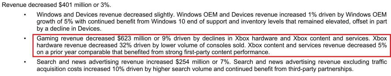 가장 눈에 띄는 하락세는 하드웨어 분야에서 나타났다. Xbox 하드웨어 매출은 콘솔 판매량이 줄어든 탓에 전년 대비 32% 급감했다. 콘텐츠 및 서비스 매출 역시 5% 감소했으나, MS 측은 이에 대해 지난해 자사의 퍼스트 파티 게임들이 기록적인 흥행을 거둔 데 따른 일종의 반작용이라고 설명했다.