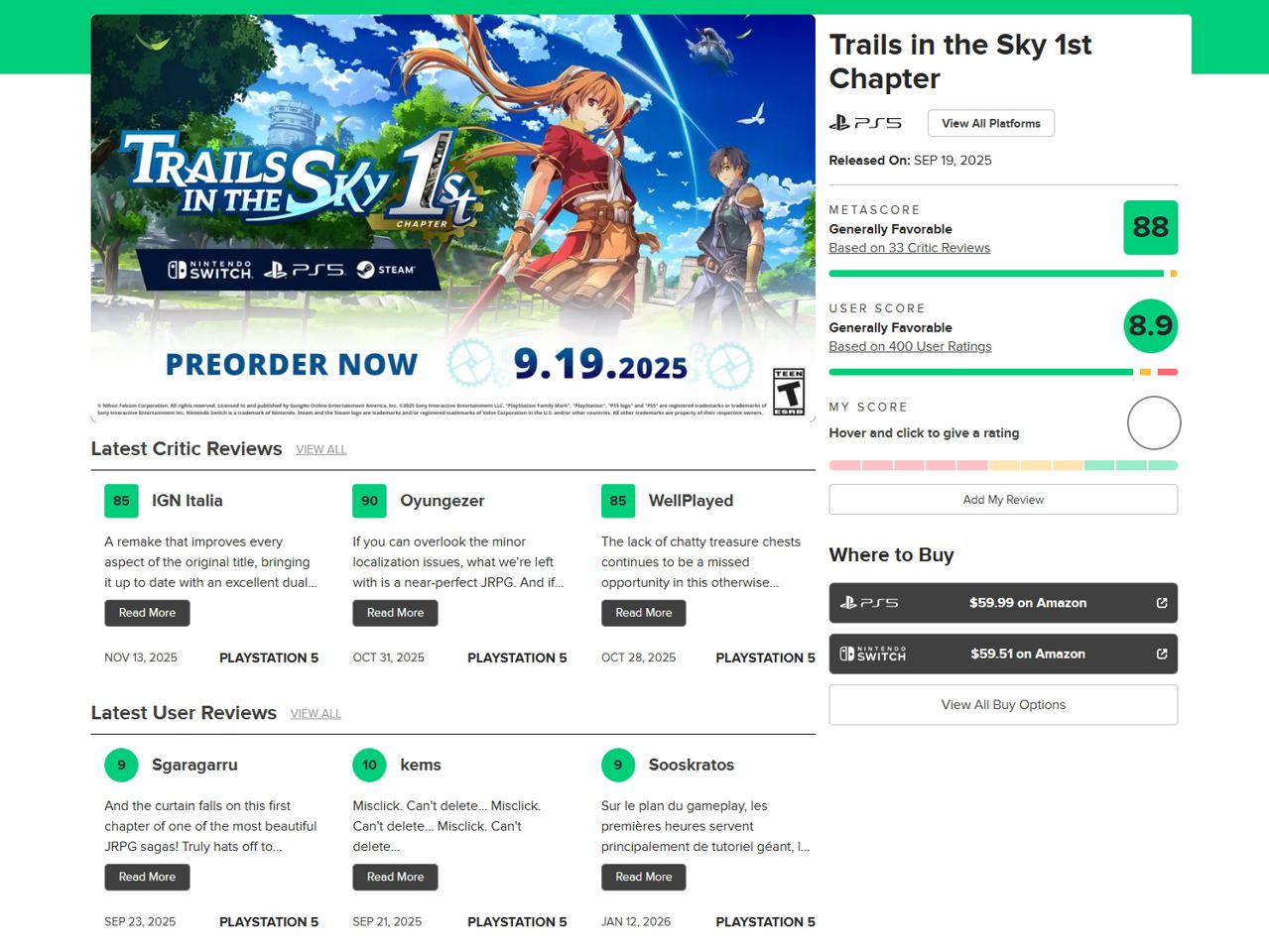 ▶ 평단과 유저 모두에게 긍정적인 평가를 받은 <하늘의 궤적 the 1st>