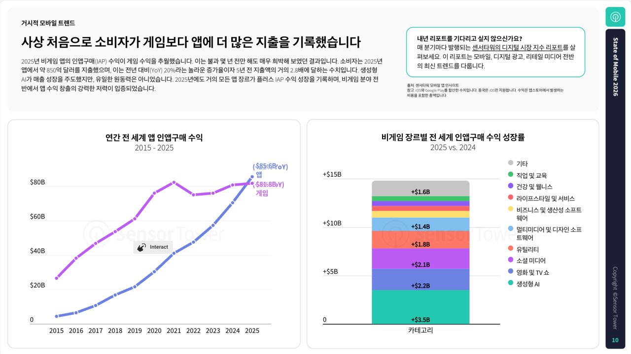 리포트는 2025년을 '성숙기에 접어든 모바일 시장이 AI라는 강력한 동력을 만나 수익성과 참여도 모두에서 새로운 정점에 도달한 해'로 정의하며, 2026년에는 AI 기반 사용자 경험 고도화와 수익화 기회 확대를 둘러싼 '주의력 경쟁'이 한층 더 치열해질 것으로 전망했다.