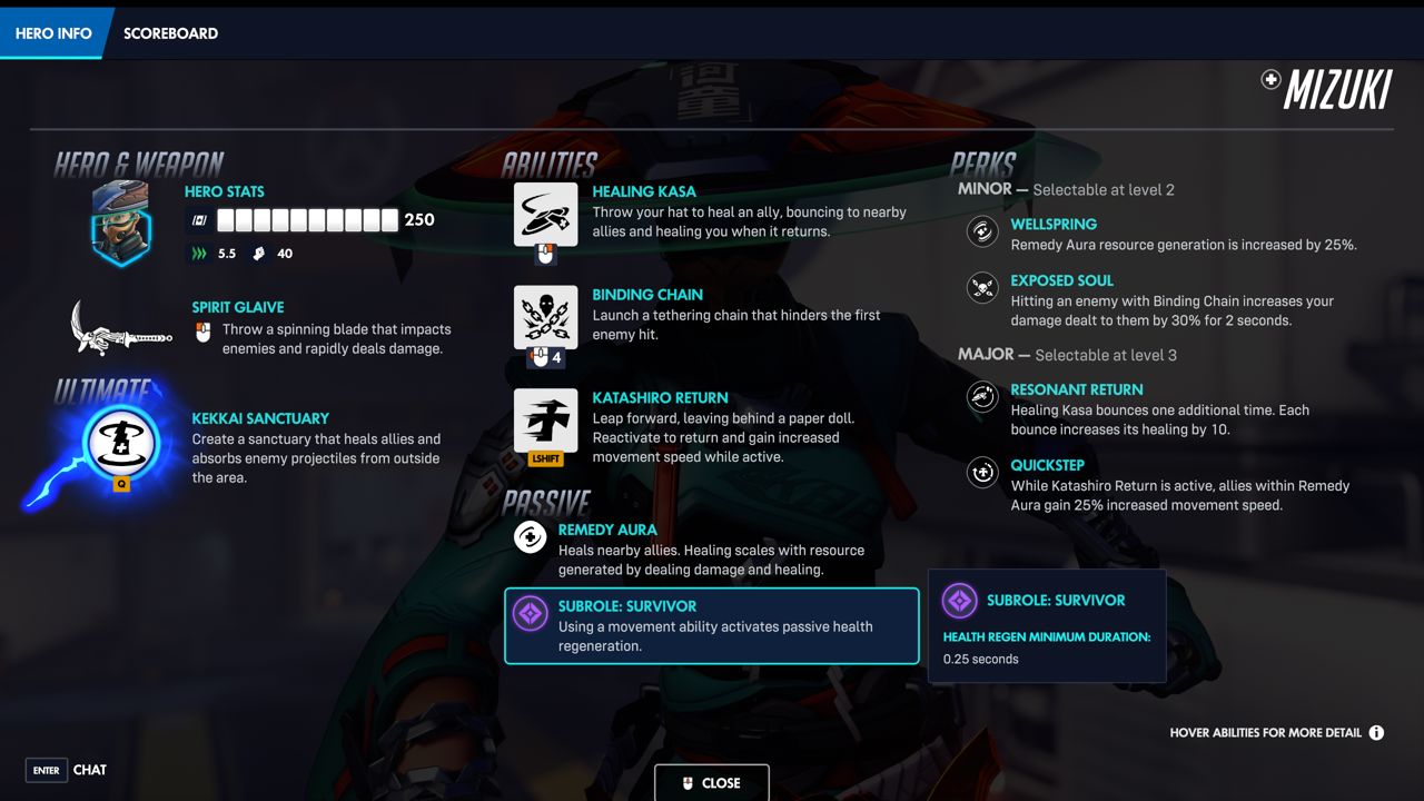 '미즈키'는 자체 생존력이 꽤 준수한 힐러로, 공방 밸런스가 잘 잡혀 있어서 초심자가 쓰기에도 좋은 영웅이었다. 멋진 외형과 스타일도 이 캐릭터를 선택할 이유가 되어주고 있다.
