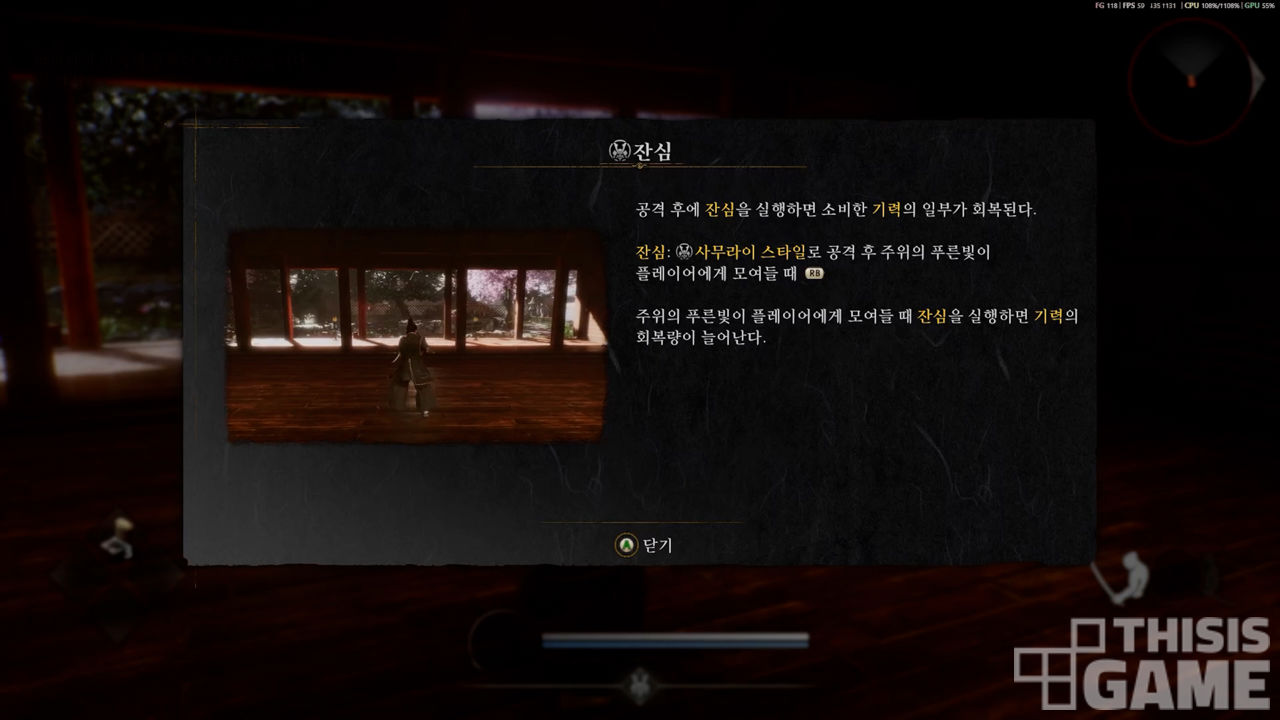 공격 동작 후 푸른 빛이 모일 때 키를 눌러 기력을 회복하는 ‘잔심’은 1편부터 이어져 온 핵심 시스템입니다. 2편에서는 잔심의 효과를 더 쉽게 받을 수 있게 됐지만 동시에 새로운 시스템들이 추가돼 복잡도는 높아졌었는데요.