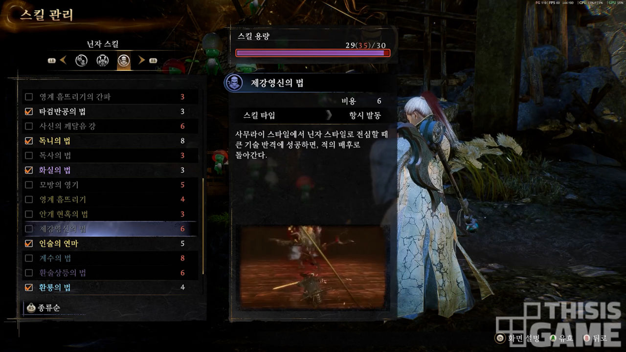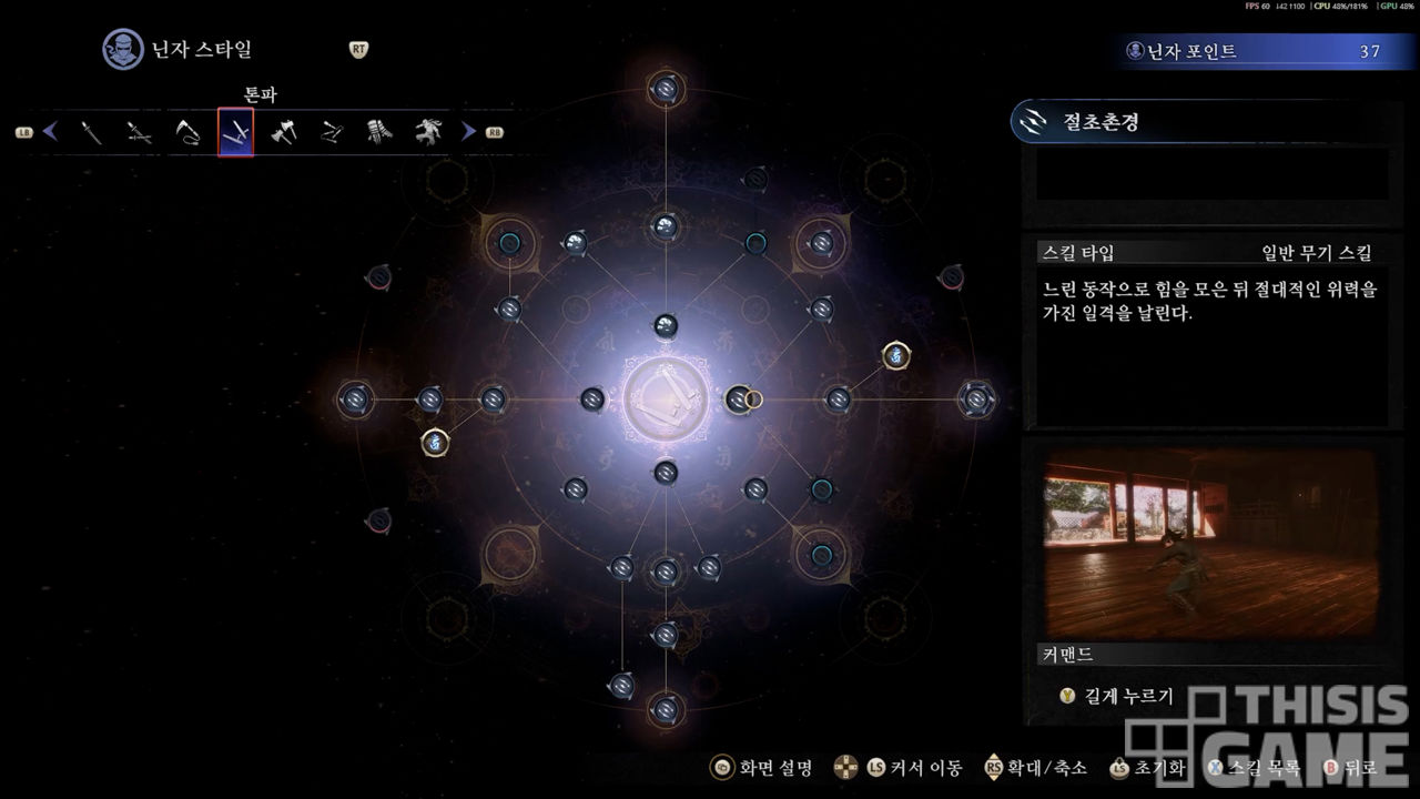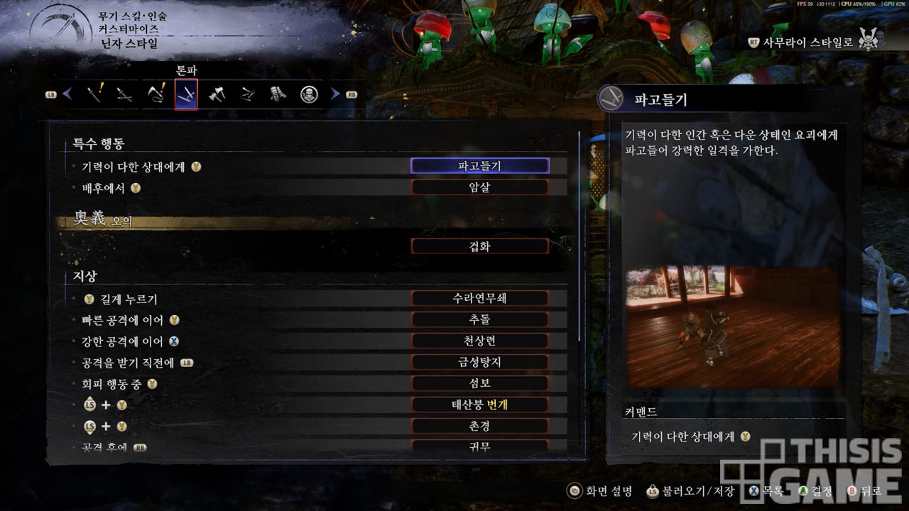 한편, 닌자 스타일은 기본적으로 기력을 굉장히 적게 쓰는 데다 잔심의 타이밍에 ‘안개’를 발동해 기력 소모 없이 회피할 수 있습니다. 또 기력을 쓰지 않고 원거리 공격을 할 수 있는 인술은 닌자 스타일에서만 사용할 수 있고요.