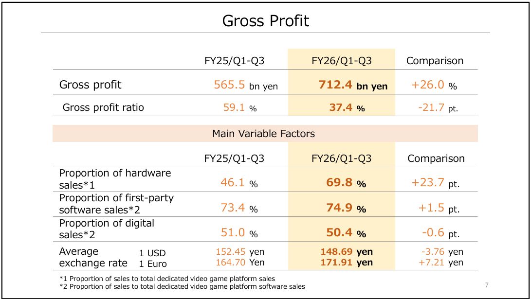 한편, 기록적인 매출 성장과 달리 수익성 측면에서는 원가 상승과 초기 비용 부담이 확인됐다. 닌텐도의 이번 3분기 누적 매출 총이익률은 전년 동기 59.1%에서 37.4%로 하락했는데, 이는 이익률이 상대적으로 낮은 하드웨어 판매 비중이 69.8%까지 상승한 영향이 컸다. 특히 닌텐도 스위치 2는 기존 기기보다 제조 원가가 높은 점과 더불어, 인공지능 수요 확대로 인한 메모리 반도체 가격 상승이 제조 원가에 압박을 가한 것으로 분석된다.