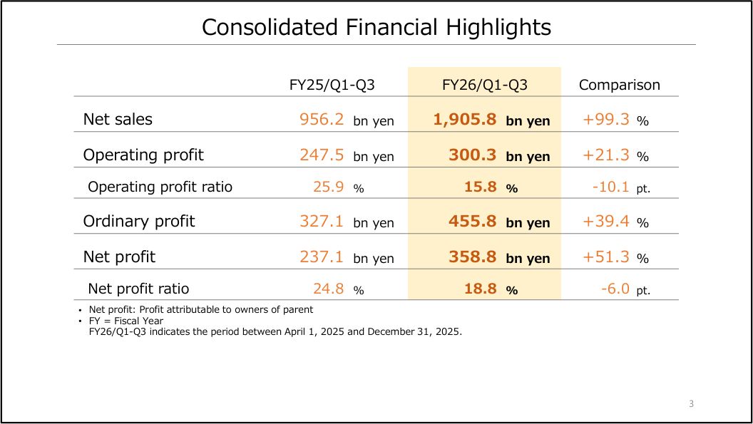 닌텐도가 발표한 2026년 3월기 실적 보고서에 따르면, 2025년 4월부터 12월까지 3개 분기 누적 연결 매출액은 전년 동기 대비 99.3% 증가한 1조 9,058억 8,300만 엔(약 17조 7,110억 원)을 기록했다.