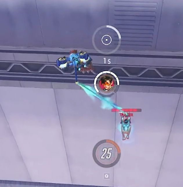 ▲ 이해를 돕기 위한 플레이 장면 예시. 제트팩 캣은 아군을 잡고 끌어 옮기거나, 적을 잡고 낙사를 시키는 등의 플레이가 가능합니다. 질문은 제트팩 캣으로 윈스턴을 공중에 들어올렸을 때 윈스턴의 서브 롤 패시브가 발동하는지 여부를 물어본 것입니다.
