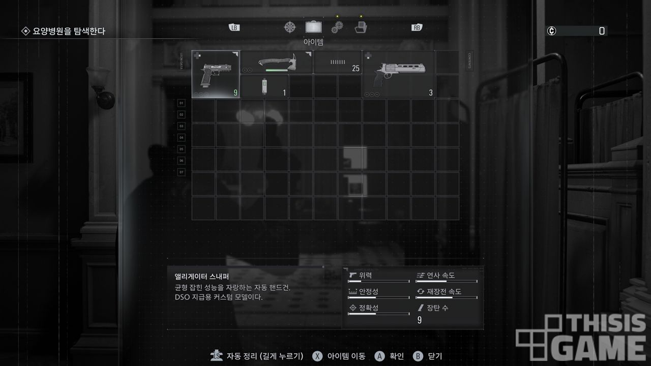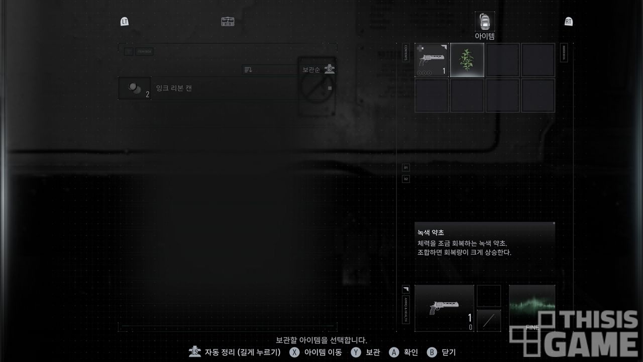 A. 그레이스의 게임 플레이에서는 제한된 아이템을 효율적으로 운용하여 가혹한 상황에서의 생환을 목표로 하는, <바이오하자드>의 전통적 서바이벌 체험을 즐길 수 있다. 시연 파트는 초반부이므로 인벤토리가 상당히 제한된 상태지만, 게임을 진행하면서 점차 확장할 수 있다.