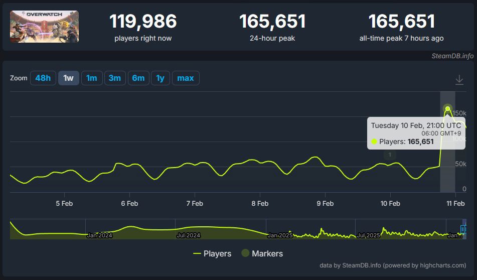 신규 영웅들과 대규모 업데이트에 대한 기대감 덕분인지 스팀에서만 16만 5,651명의 동시 접속자 수를 기록하며, 스팀 출시 이후 최대 동접 기록을 달성한 <오버워치>다.
