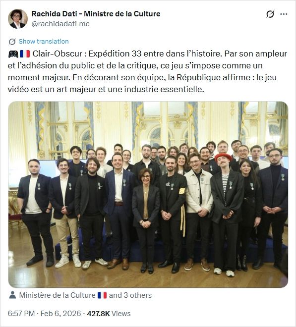 시상식에서 문화부 장관 라시다 다티는 찬사를 아끼지 않았다. "여러분의 작품은 이미 프랑스 전자게임 역사상 중요한 이정표가 됐다." 그는 업계 전체가 어려움을 겪는 상황에서 <클레르 옵스퀴르: 엑스페디션 33>이 플레이어와 평론계의 일치된 호평을 받았을 뿐 아니라, "문화 실천, 산업 의제, 소프트파워 지렛대, 나아가 독립적 예술 형식으로서의 다층적 가치를 드러냈다"고 강조했다. 그는 심지어 "게임은 더 이상 특정 연령이나 계층에만 속하지 않으며, 이미 우리 문화생활의 일부가 됐다"고 단언했다.