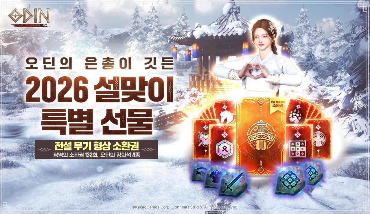 북유럽 신화 배경의 MMORPG <오딘: 발할라 라이징>에서는 설 연휴를 맞아 다양한 이벤트를 진행해 이용자 맞이에 나섰다. 먼저, 오는 25일까지 서비스 기간 중 최초로 '전설의 무기 형상 소환권'을 인게임 상점에서 무료 배포한다. 이어 3월 18일까지 출석 이벤트를 통해 '광명의 소환권', '오딘의 무기/방어구/장신구 강화석'을 지급한다. 같은 기간 설날을 기념해 '유물' 관련 미션을 수행한 이용자에게 '오딘의 유물 강화석' 2개를 보상으로 제공한다. 이 밖에도 필드 혹은 정예 던전에서 획득한 '행운의 씨앗'을 '가온누리 외형 획득권', '2026 설 복주머니' 등 아이템으로 교환할 수 있다. 이와 함께, 16일부터 18일 설 연휴 3일간 게임에 접속한 이용자에게 '광명의 소환권'을 최대 66장 제공하는 이벤트를 마련해 명절 분위기를 한층 끌어올릴 예정이다.