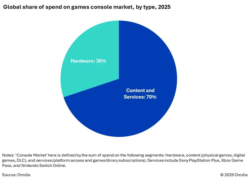 ▶ 2025년 게임 콘솔 플랫폼에 대한 소비자 지출의 70%를 차지한 콘텐츠 및 서비스 부문. (출처: 옴디아)