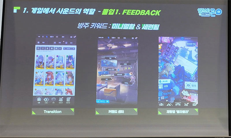 가령 '캐릭터 일람' 화면에서는 화면을 넘길 때마다 '사진을 찍는다'는 느낌을 주기위해 셔터음을 넣었다. '주크 박스' 화면에 진입할 때는 마치 실제로 주크박스를 조작하는 것처럼 처음에 볼륨이 튀는 연출을 넣었다. 기타 지휘관실 각각의 메뉴는 모두 '이 장소에서는 어떤 소리가 나야 할까'에 맞춰서 다르게 디자인했다.