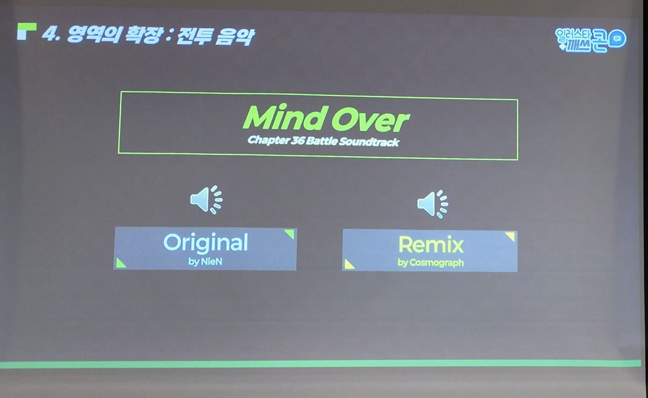 챕터 36의 전투 음악인 'Mind Over'의 경우, NieN 님이 작곡한 오리지널 OST를 주종현 사운드 디렉터가 리믹스했다고 한다. 이런 식으로 '여러 작업자'들의 결과를 리믹스하는 식으로도 변주와 변화를 꾀했다고. 실제 음악이 어떤지는 아래 영상을 통해 확인하자.