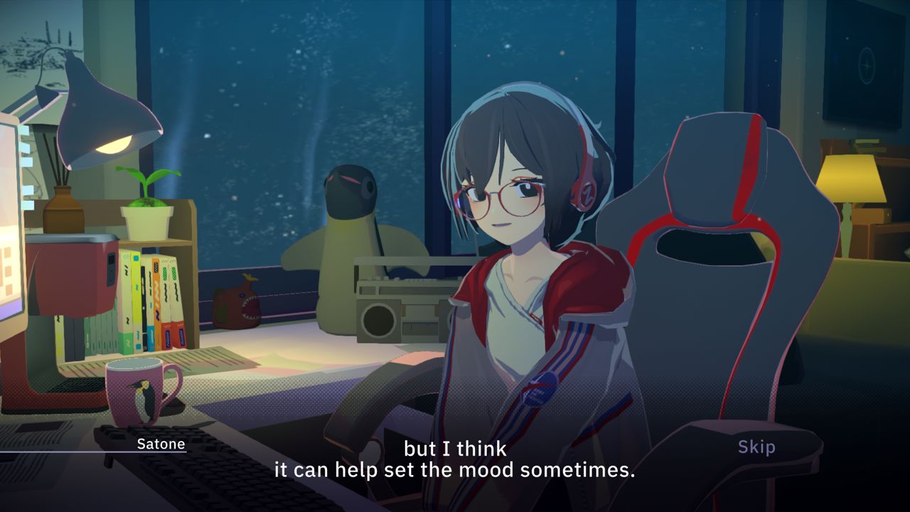 <칠 위드 유>는 소설 쓰기를 좋아하는 소녀 '사토네'와 '작업 통화'를 하며 공부나 데스크워크 등 각종 작업에 집중하도록 돕는 '작업 효율화×어드벤처' 게임이다. 이용자는 작업 중 풍경을 바꾸고, 환경음과 Lo-Fi 음악을 자유롭게 조합해 자신에게 맞는 집중 환경을 만들 수 있다. 네스토피는 사토네와 함께 작업을 계속하다 보면 언젠가 사토네가 마음을 열지도 모른다는 방향의 서사를 함께 제공한다고 설명했다.